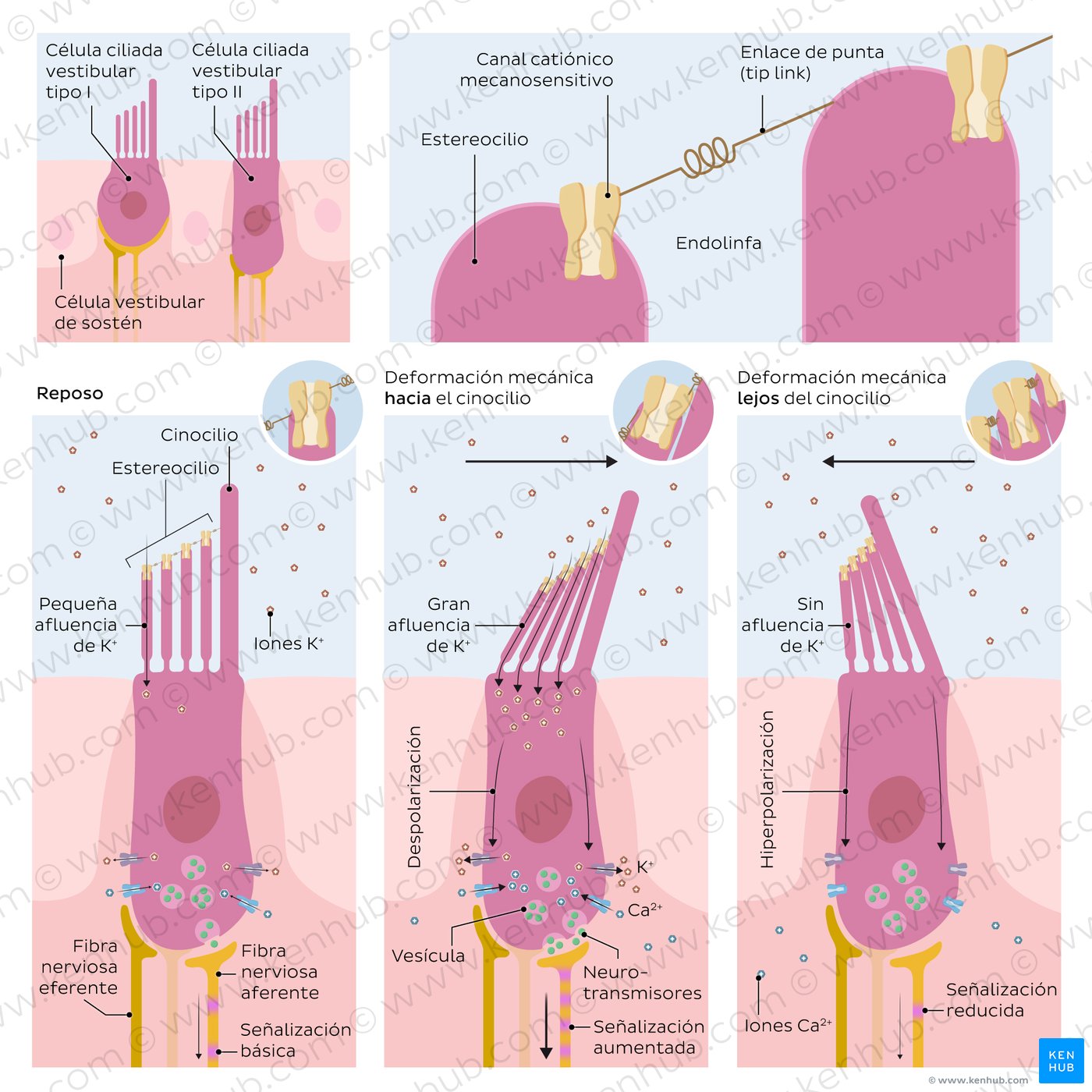 Definición: proceso por el que las células ciliadas vestibulares convierten estímulos mecánicos en señales eléctricas Mecanismo: Despolarización: desviación de los estereocilios hacia el cinocilio > apertura de canales catiónicos > entrada masiva de K+ > apertura de canales de Ca2+ regulados por voltaje > aumento de glutamato y de señalización al encéfalo Hiperpolarización: desviación de los estereocilios en dirección opuesta al cinocilio > cierre de canales catiónicos > disminución de entrada de K+ y Ca2+ > disminución de liberación de glutamato y de señalización al encéfalo |
