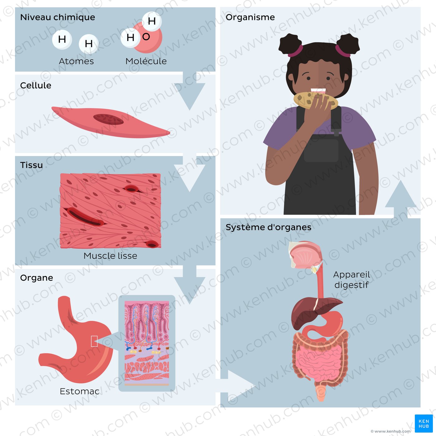 Apprenez à connaître les six niveaux d'organisation à l'aide de l'exemple illustré ici.