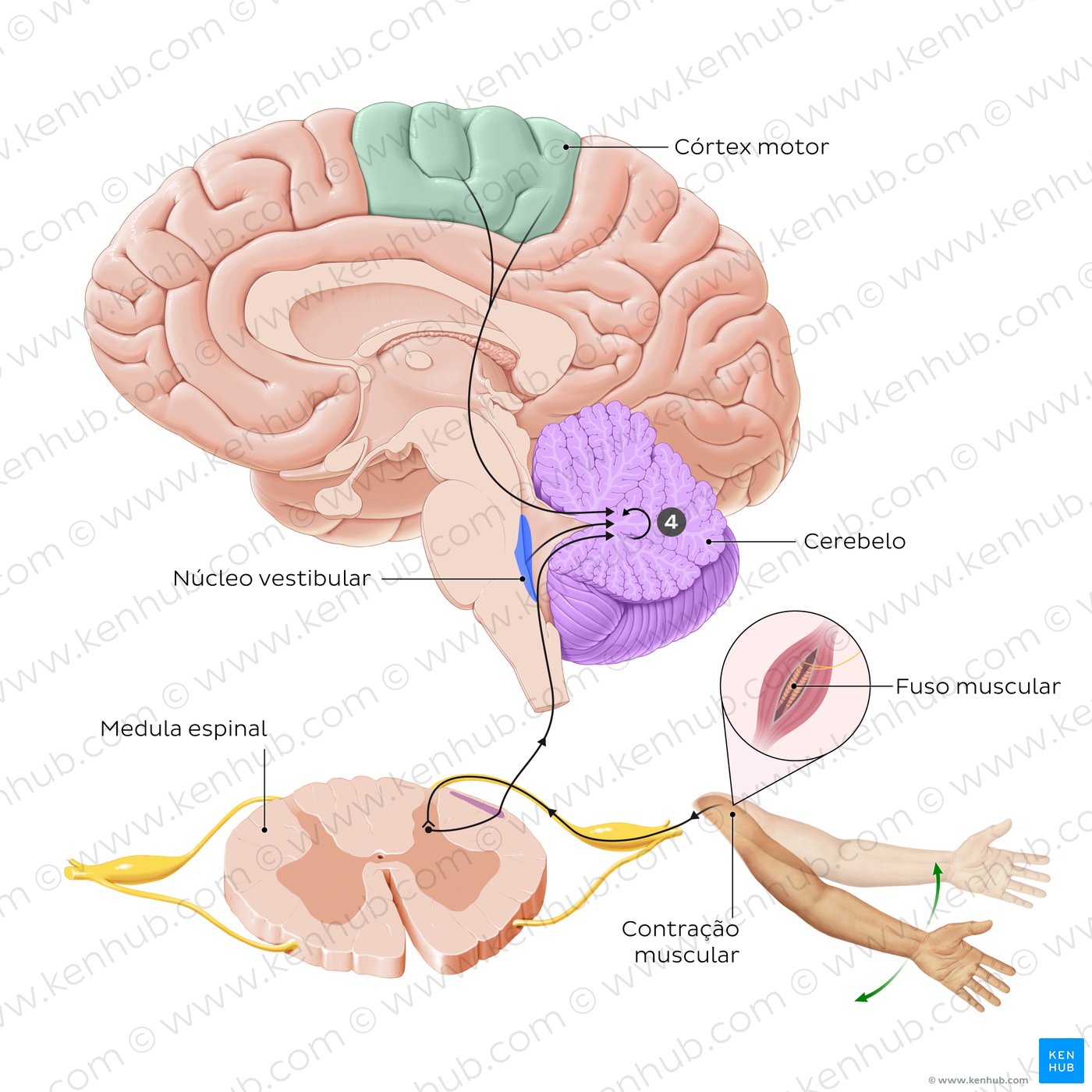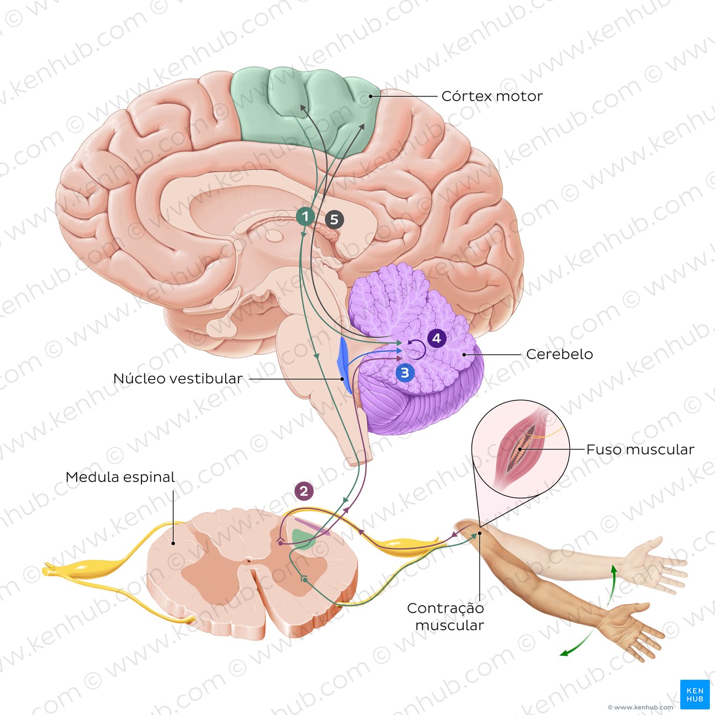 Uma vez que o plano motor é formulado e os movimentos são iniciados, o cerebelo é a principal estrutura responsável por monitorá-los. O cerebelo compara os comandos motores descendentes do córtex motor com o movimento real (através, por exemplo, de feedback sensorial dos músculos e articulações). Se forem detectadas diferenças entre o movimento planejado e o movimento real, o cerebelo corrige o resultado motor através de comunicações com o córtex motor e o sistema extrapiramidal.