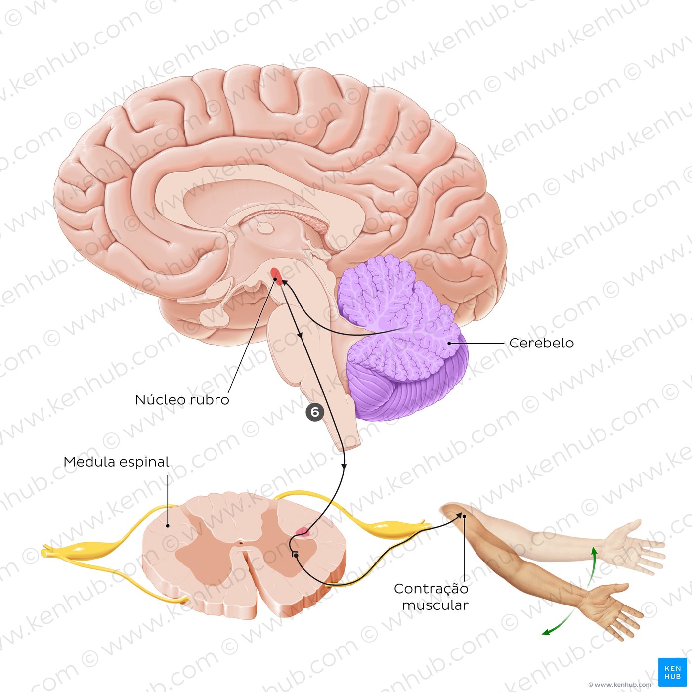 O trato rubroespinal se origina no núcleo rubro, decussa imediatamente e cursa inferiormente através da ponte e do bulbo para entrar no funículo lateral da medula espinal. Esses neurônios formam sinapses com os neurônios motores inferiores em todos os níveis da medula espinal. Acredita-se que o trato rubroespinal contribui com a regulação de movimentos involuntários, como o tônus de músculos agonistas e antagonistas dos membros, bem como com o controle motor fino.