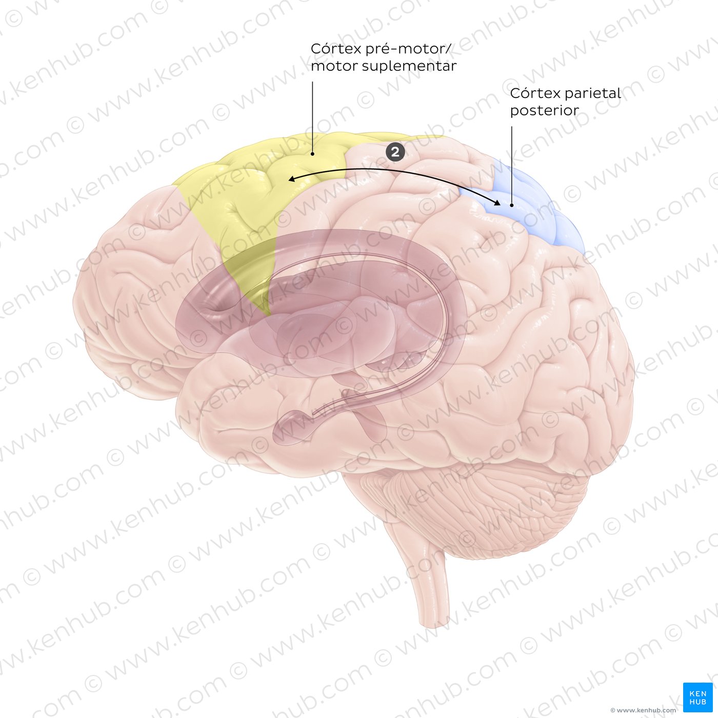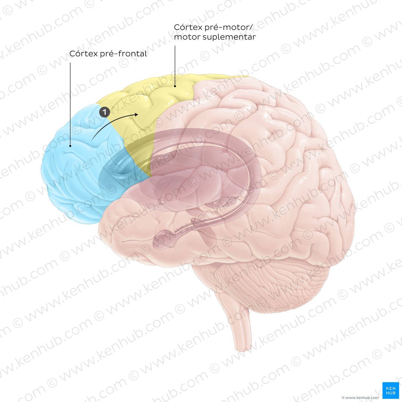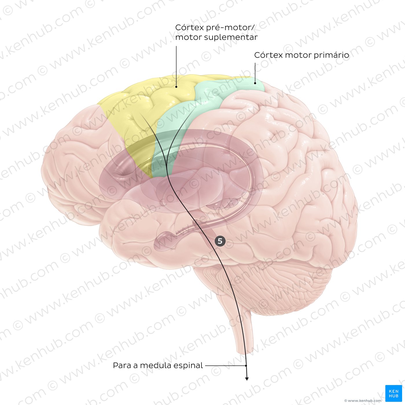 Córtex motor secundário (área pré-motora, área suplementar): com impulsos do córtex pré-frontal, córtex sensorial, neocerebelo e núcleos da base |