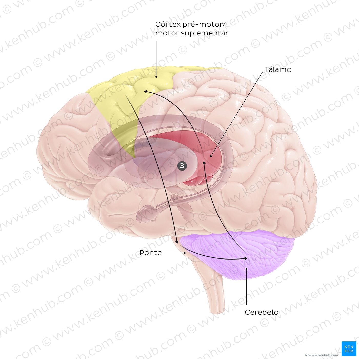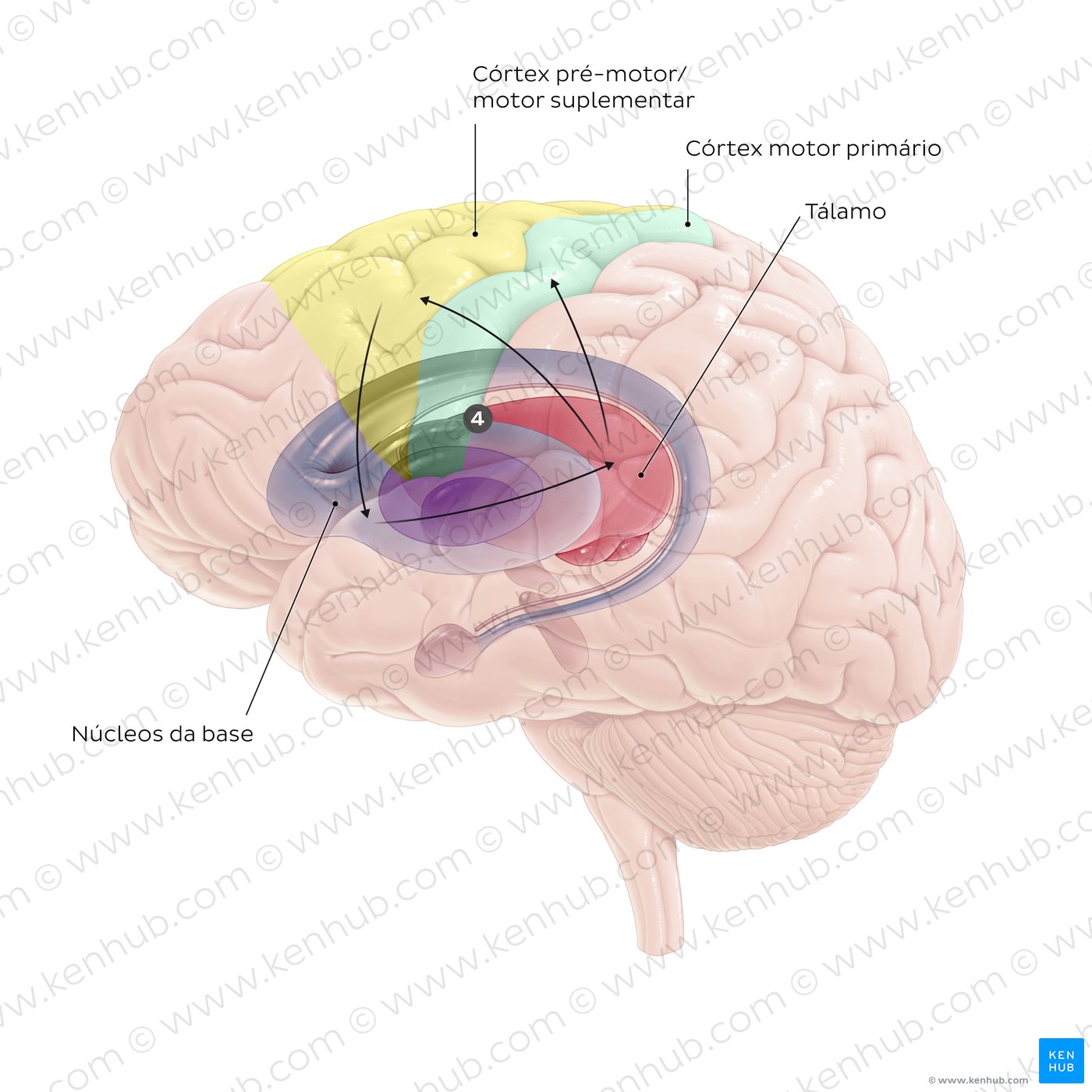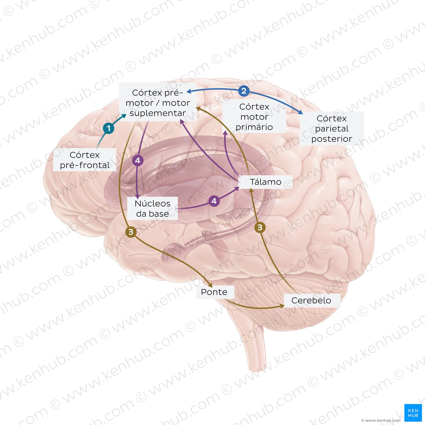 Além de estimular a contração muscular, outras áreas do encéfalo contribuem ainda com o controle dos movimentos. Uma vez que a decisão de se mover é tomada, as áreas motoras secundárias (córtex pré-motor e córtex motor suplementar) realizam um refinamento do planejamento motor. Essas áreas se comunicam com três áreas importantes do encéfalo para melhorar o planejamento motor: