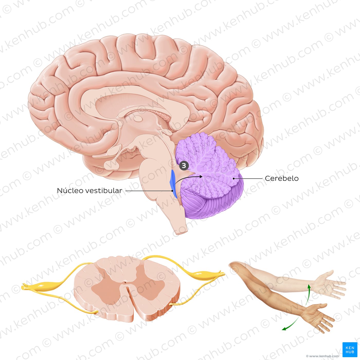O trato vestibuloespinal é subdividido nos tratos vestibuloespinais medial e lateral. O trato vestibuloespinal lateral se origina do núcleo vestibular lateral e cursa inferiormente ao longo da coluna anterior da medula espinal, alcançando todos os níveis vertebrais. O trato vestibuloespinal medial se origina do núcleo vestibular medial e cursa inferiormente ao longo do fascículo longitudinal medial, chegando até o nível espinal torácico médio. Os tratos vestibuloespinais são regulados pelo sistema vestibular e pelo cerebelo, e seu funcionamento ativa principalmente músculos antigravitacionais, no contexto da postura e do equilíbrio. O trato vestibuloespinal medial inerva principalmente músculos do pescoço.