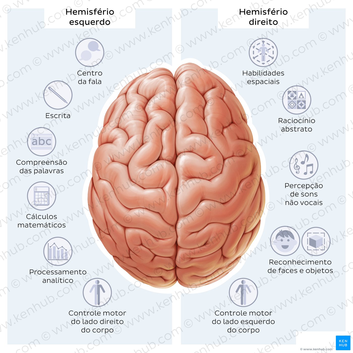 Hemisfério esquerdo: Linguagem (formação e compreensão de palavras) e em pensamento analítico, incluindo raciocínio matemático. Hemisfério direito: Consciência espacial, reconhecimento de faces e objetos e raciocínio abstrato. Observação: Os dois hemisférios atuam em conjunto na maioria das tarefas cognitivas. |