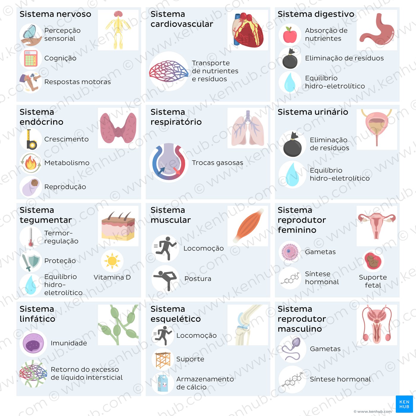 Organ systems | Sistema tegumentar Sistema esquelético Sistema muscular Sistema nervoso Sistema endócrino Sistema respiratório Sistema cardiovascular Sistema linfático Sistema digestivo Sistema urinário Sistema reprodutor masculino e feminino |